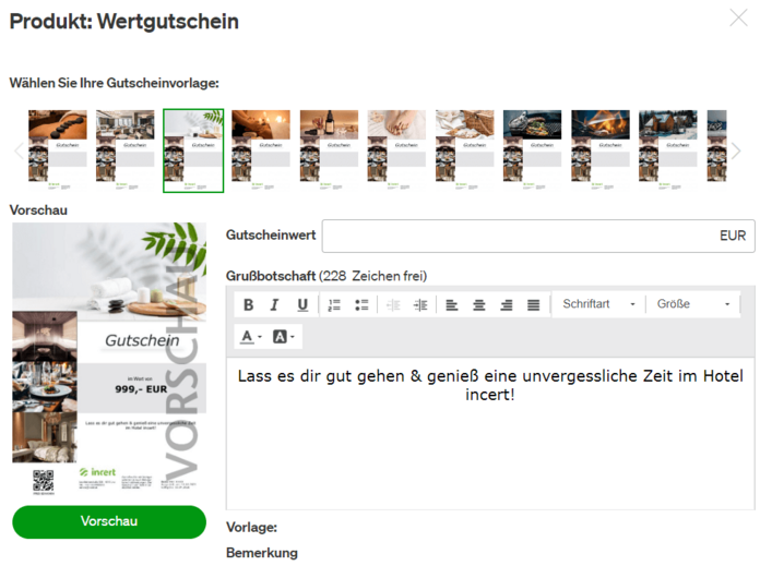 - Text: Gib deinen Kunden die Möglichkeit, eine persönliche Nachricht auf dem Gutschein zu hinterlassen. Sorge dafür, dass genügend Platz vorgesehen ist und eine benutzerfreundliche Editor-Oberfläche zur Verfügung steht.